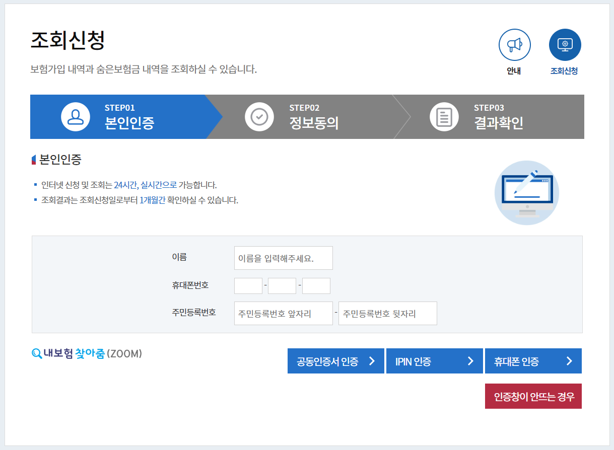 휴면보험금을 찾고 싶다면 https//cont.insure.or.kr 사이트를 이용해보세요. 이 사이트는 휴면보험금 통합조회시스템으로, 한 번의 조회로 여러 보험회사의 휴면보험금을 확인할 수 있습니다.